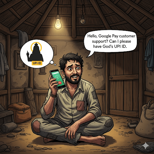 கடவுளோட போன் நம்பர் என்ன? இல்லன்னா, அவரோட UPI ஐடி என்னவா இருக்கும்? ‘kadavul@heaven’ன்னு இருக்குமோ?” என்று தனக்குத்தானே பேசிக்கொண்டான்.